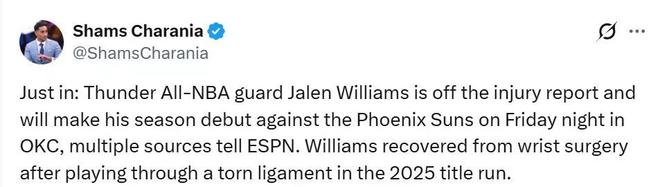 根据ESPN名记Shams报道,因手腕伤势赛季缺席至今的杰伦威廉姆斯已从伤病名单中被移除,确定将在雷霆对阵太阳的比赛中迎来首秀。